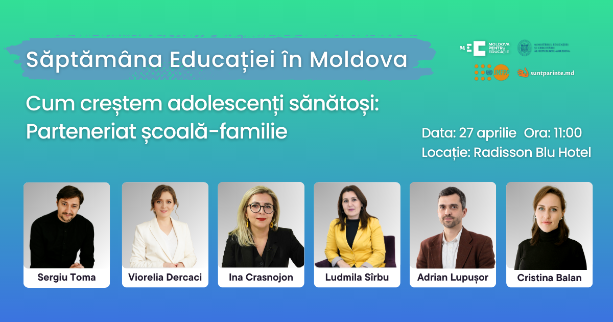 Iată de ce Ministerul Educației și Cercetării, în parteneriat cu Fondul ONU pentru Populație și platforma media Suntparinte.md, organizează Conferința „Cum creștem adolescenți sănătoși: Parteneriat școală-familie”.